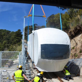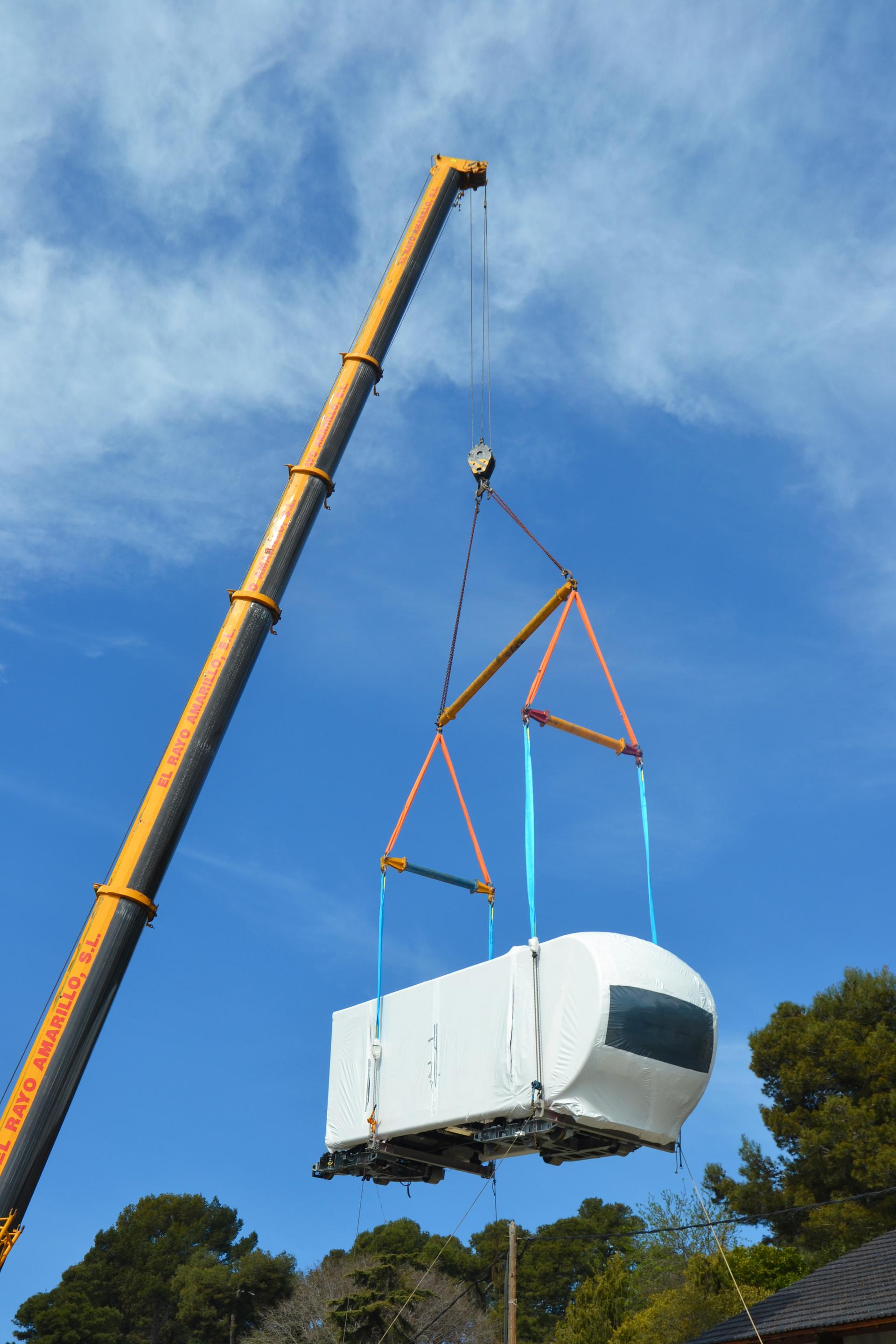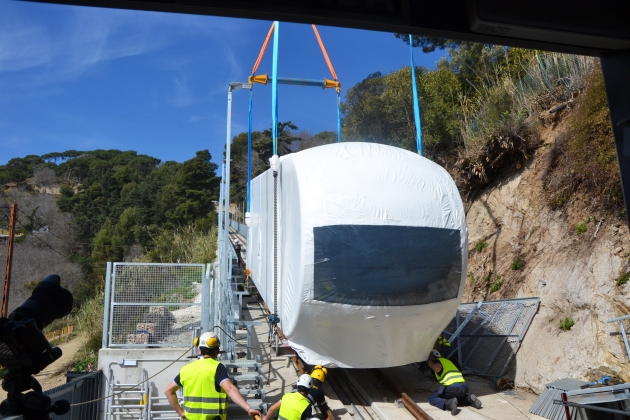 Dos grans camions han traslladat els dos vagons que componen el vehicle del nou funicular amb una góndola especial per transportar material ferroviari. L’operació de col·locació dels vagons a les vies s’ha realitzat amb una gran grua de 220 tones amb una durada dels treballs de vuit hores d’inici a final. És una operació que requereix gran precisió i que es tornarà a repetir el pròxim 18 de març, quan arribi a la ciutat el segon vehicle. Durant les pròximes setmanes s’iniciaran els treballs de connexió i regulacions mecàniques, es posaran en servei tots els components, es realitzaran les verificacions de tots els elements i els viatges de prova als diversos tipus de velocitat i condicions de càrrega, entre altres operacions prèvies a la posada en funcionament. Posteriorment a l’autorització per part de Transports de la Generalitat, es procedirà a dur a terme unes jornades de marxa en blanc de la instal·lació.