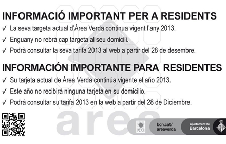 Avui comença la campanya informativa als ciutadansL’actual targeta de resident de l’Àrea Verda continuarà sent vàlida durant l’any 2013 i els usuaris no hauran de fer cap canvi. La targeta és imprescindible per a operar i estacionar a la zona d’Àrea Verda i permet obtenir tiquets per a estacionar a la zona que pertoqui.