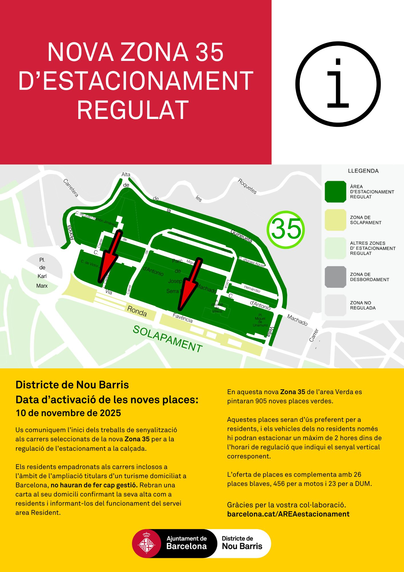 Els límits d’aquesta nova zona regulada l’estableixen la plaça de Karl Marx, la ronda de la Guineueta Vella, la Via Favència i el carrer de l’Artesania. Les places ubicades en aquesta nova Zona 35, que s’identifiquen amb pintura verda, seran d’ús preferent per a residents i els vehicles no residents només hi podran estacionar un màxim de dues hores dins de l’horari de regulació que indiqui el senyal vertical corresponent.