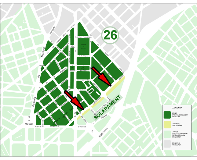 Les places regulades d’aquesta nova Zona 26 seran places Verdes (estacionament mixt resident i forà) i quedaran identificades amb pintura verda. Això significa que, amb l’objectiu de prioritzar l’estacionament dels residents, els vehicles dels no residents a la Zona 26 només podran estacionar un màxim de 2 hores dins de l’horari de regulació que indiqui el senyal vertical corresponent.